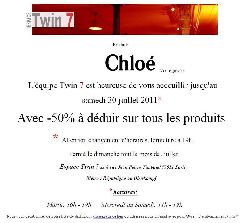 Des produits d'une marque de luxe en promo hors période de soldes c'est possible ? Et bien oui ! Avec l'espace Twin 7, profitez jusqu'au 30 juillet de réductions sur la marque Chloé : textile, chaussures, maroquinerie, accessoires... Vous trouverez forcément une pièce qui vous plaira !